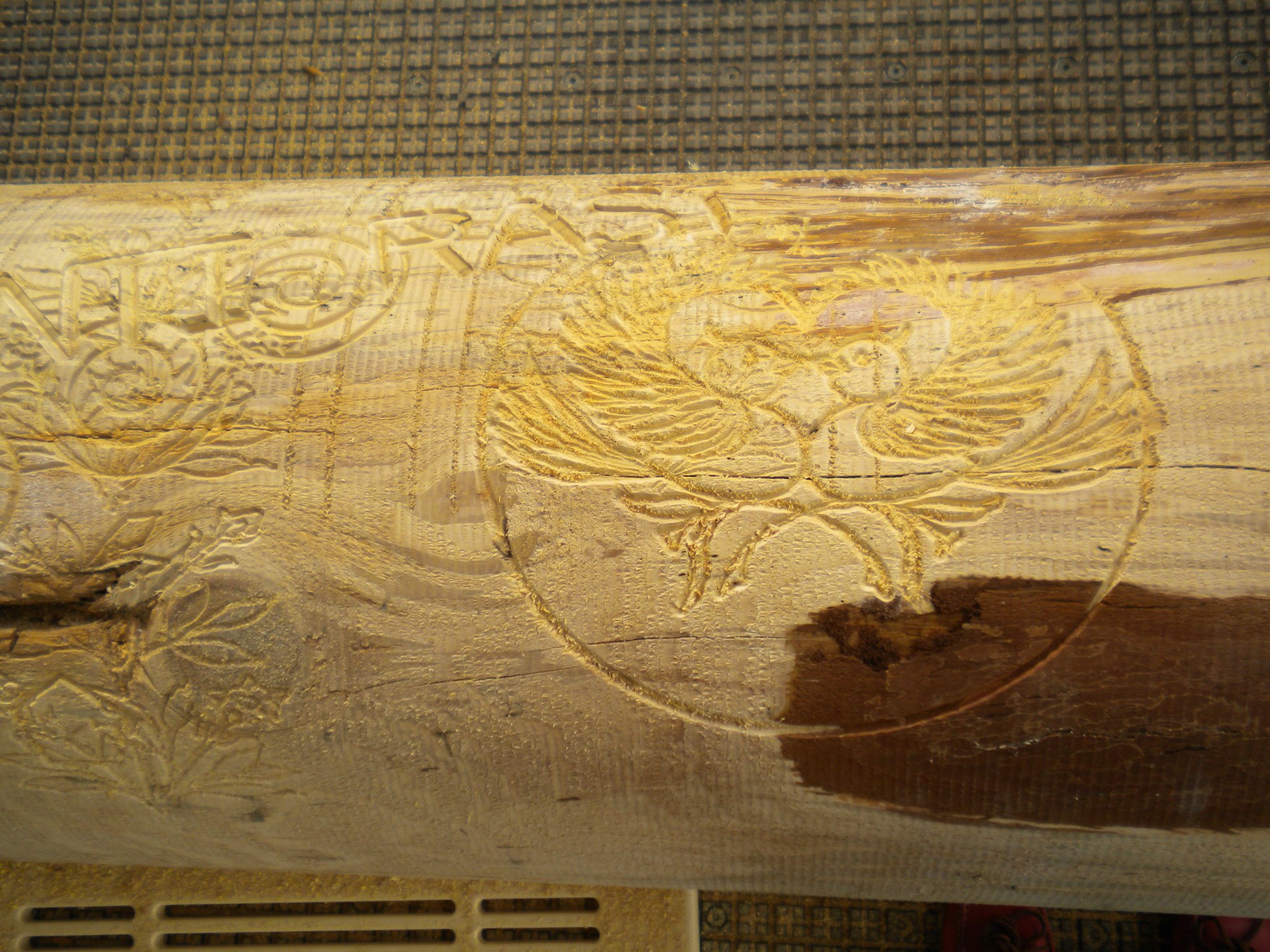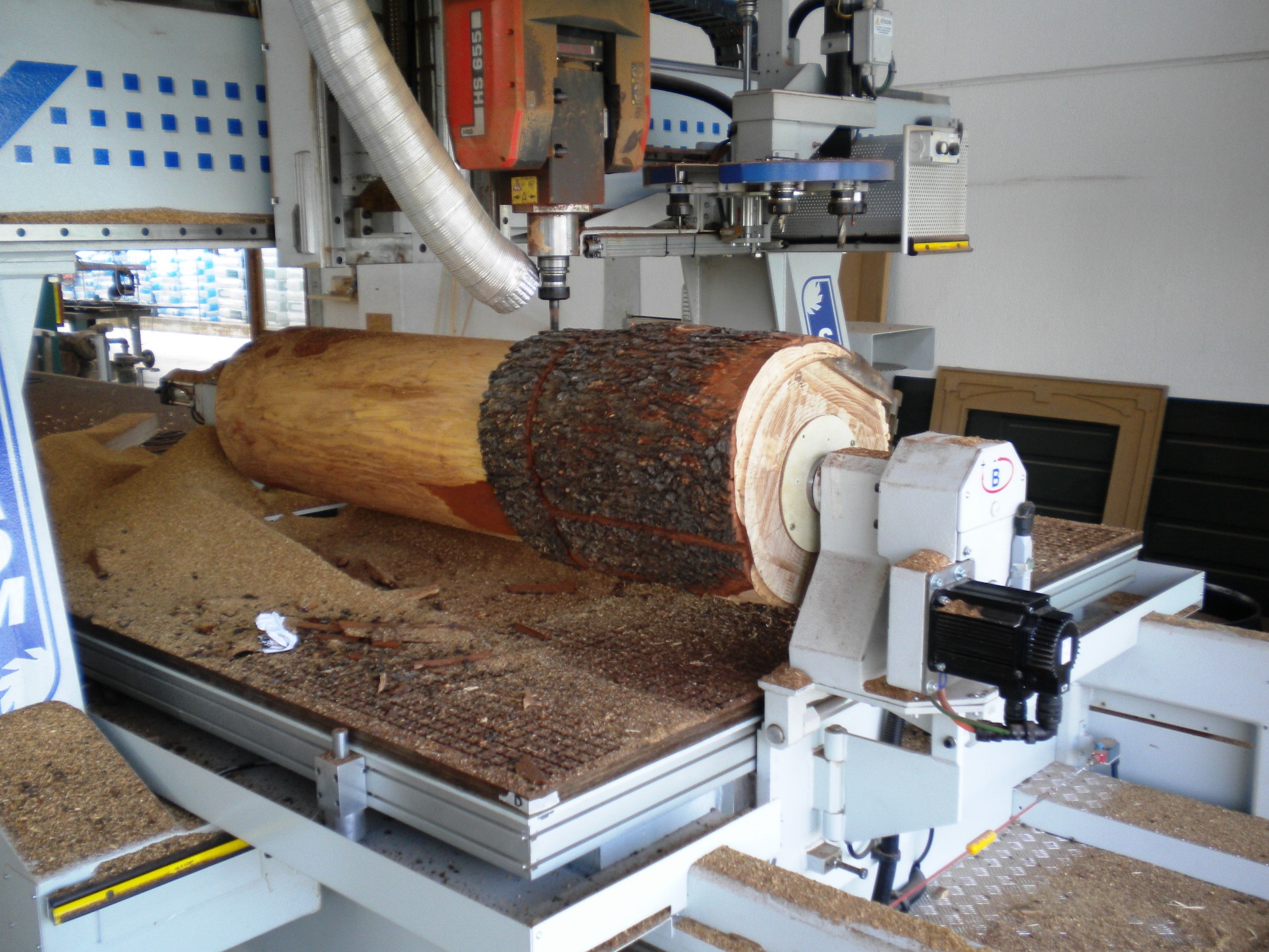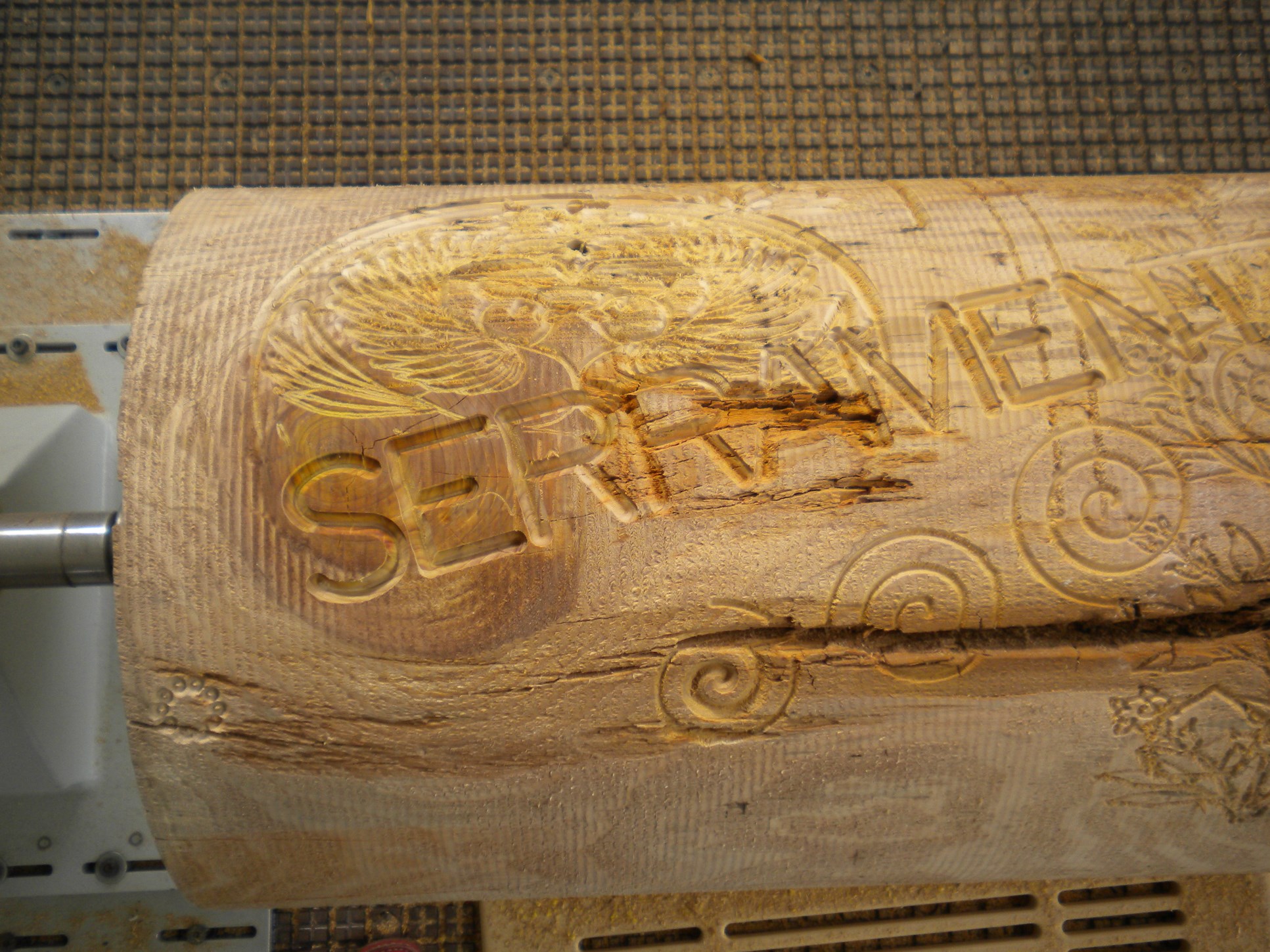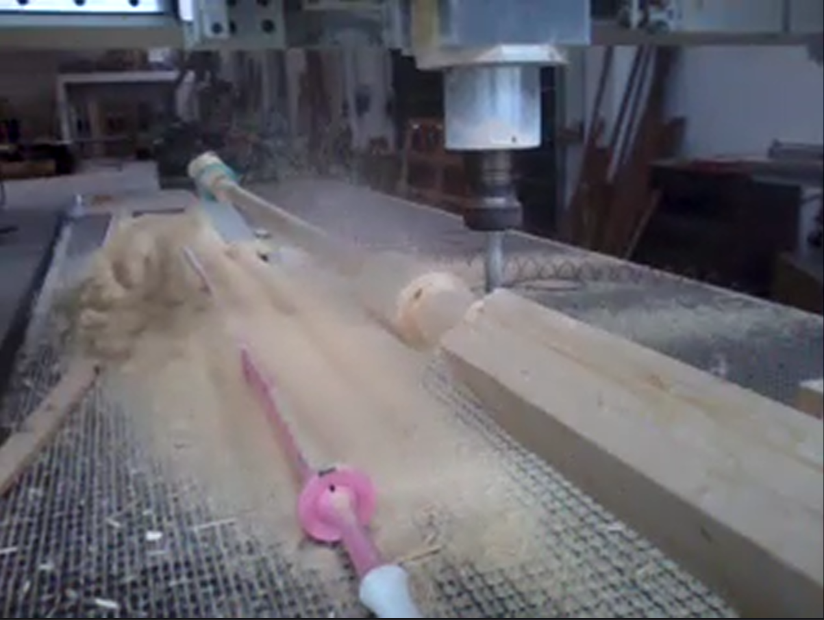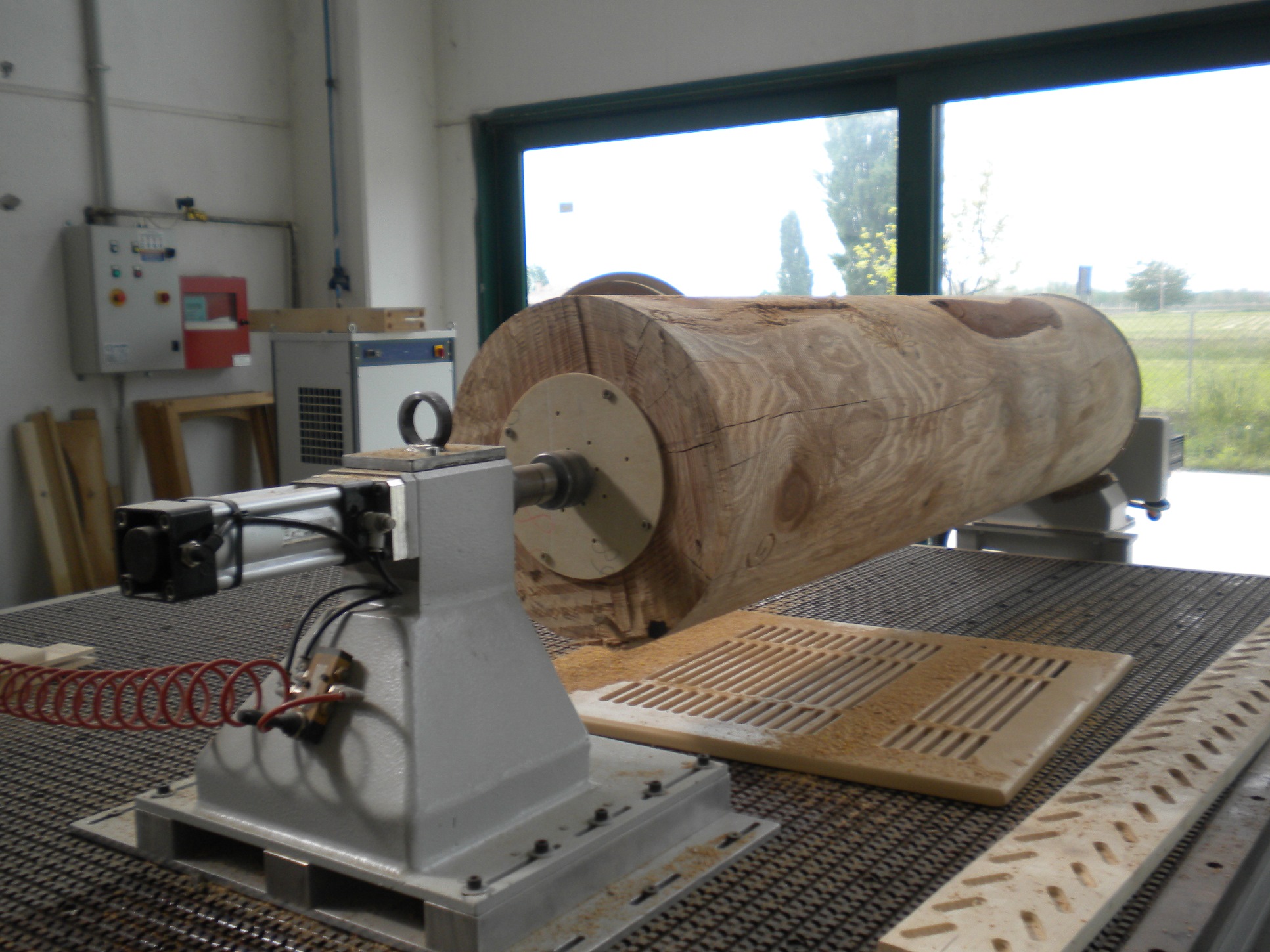 Tornio Tronco grezzo posizionato nel tornio Scortecciatura Tronco sgrossato Incisioni wrapping 3D Incisioni wrapping 3D Produzione di una lancia da palio Lancia da palio